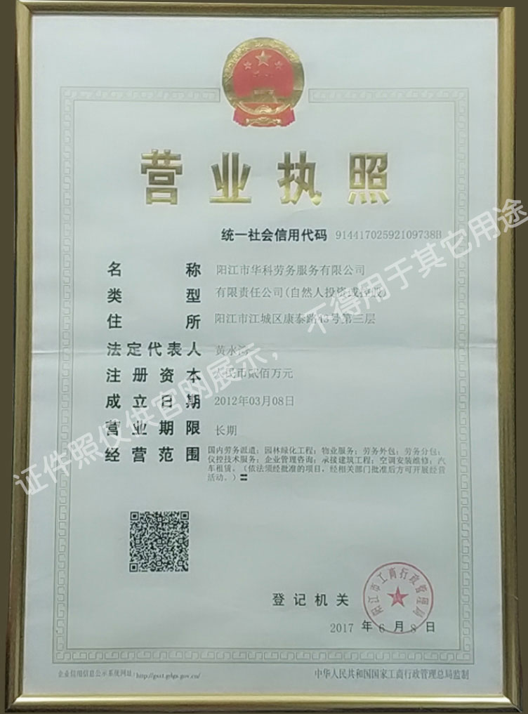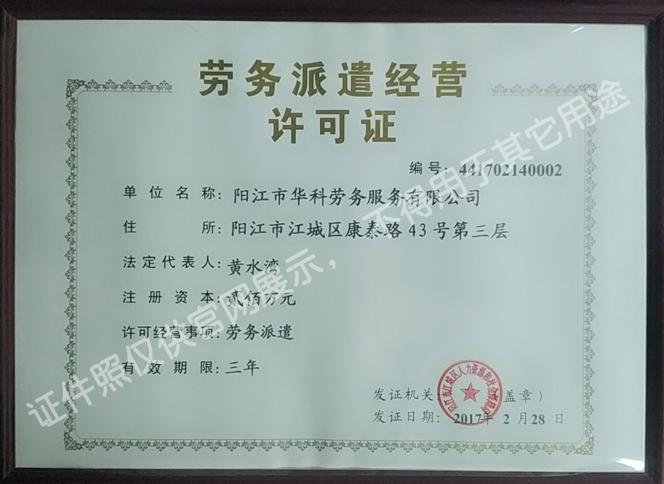 首批獲得廣東省人力資源廳、陽(yáng)江市勞動(dòng)和社會(huì)保障局頒發(fā)人力資源許可證的合法單位